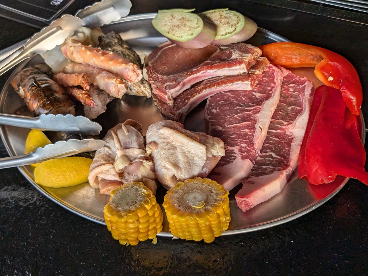 でした、ボリューム満点で2人で食べきれない量でした、サラダバー、ご飯に味噌汁、フルーツもありました、ビールはピッチャーで、スタッフさんがすぐに入れに来てくれます、余り冷えてなくて…アイスティーはかなり甘いので気を付けて下さい、とにかくバーベキューなので暑いです!煙も凄いです!服装にはご注意を!
