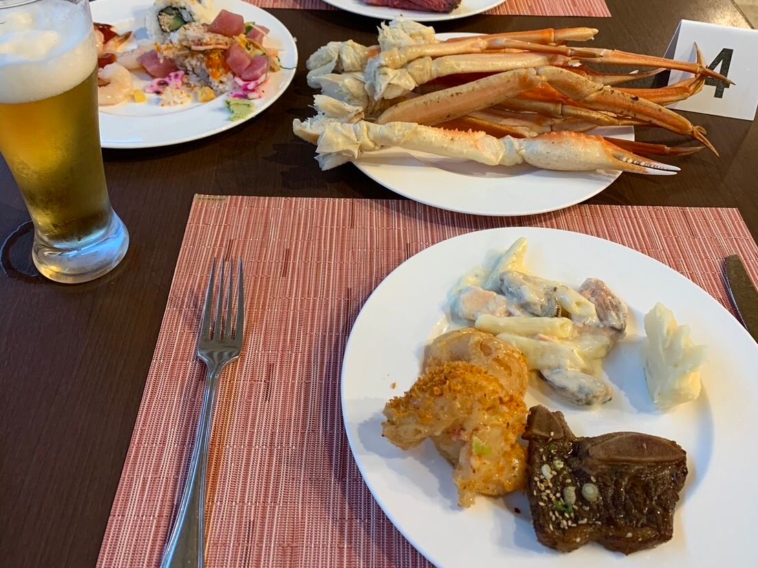 食べ物は、ローストビーフやパスタ、サラダなどオーソドックスなビュッフェの物あり。カニがあったので沢山食べました。日本食は、おでん、ラーメン、うどん、ちらし寿司、巻き寿司、小さな鰻など。デザートはチョコケーキやプリン、アイスなどでした。沢山食べました。