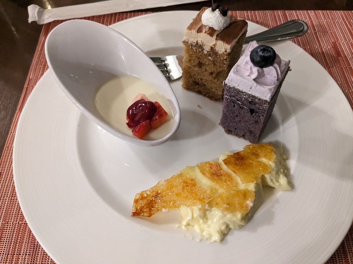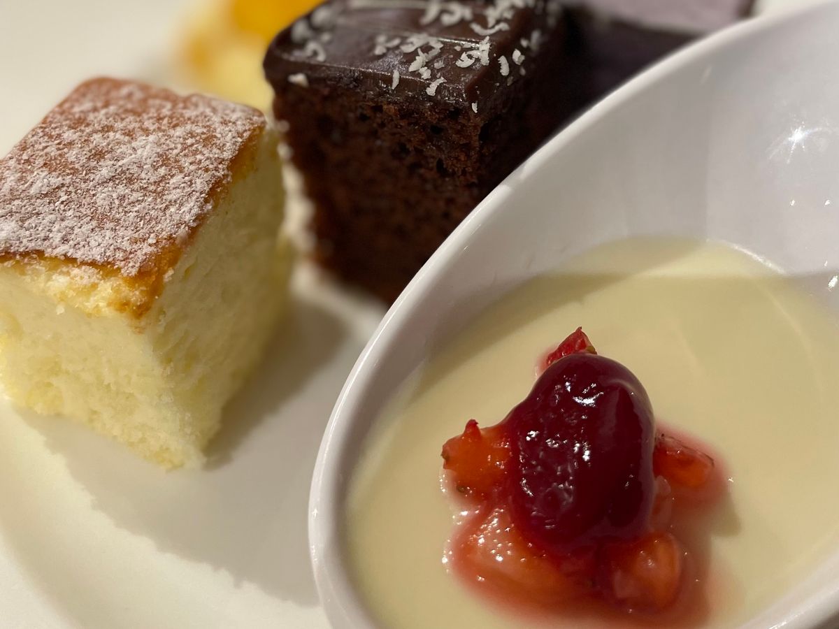 ケーキ2種類、プリン、クレームブリュレ、シュークリームや水まんじゅうなど、種類豊富です。ケーキはパウンドケーキの様な食感で少しお腹に溜まります。プリン、クレームブリュレはとても美味しく、クレームブリュレはおかわりするレベルでした。