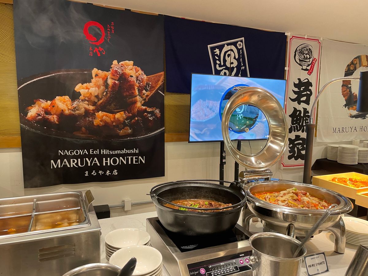 乾杯のあとはいざ出陣です。私は前菜をすっ飛ばしていきなりローストビーフをいただきました。スタッフの方が塊肉をカットしてくれます。とても美味しく2回お代わりしちゃいました。またエビがおすすめです。大きさとプリっと感最高です。日本食も豊富で串カツ、味噌カツ、きしめん、おでんまでありました。