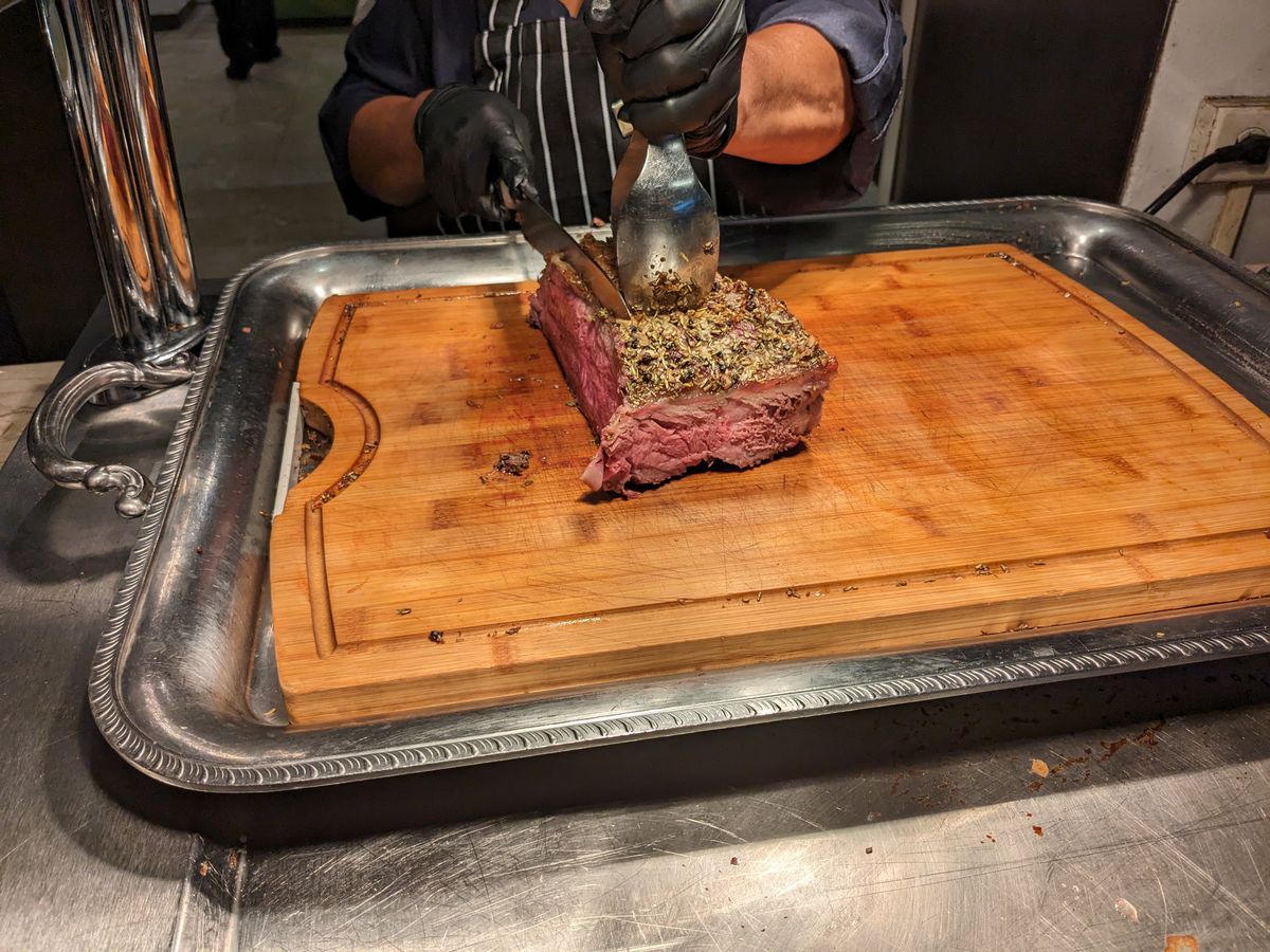1番の目玉であるサーロインのローストビーフは目の前でカットしてもらえます。スタッフさんによって分厚さが異なり、ステーキのような厚さで出して下さりました笑焼き加減も最高でお肉がとても柔らかいので分厚くてもとても美味しく食べられました。