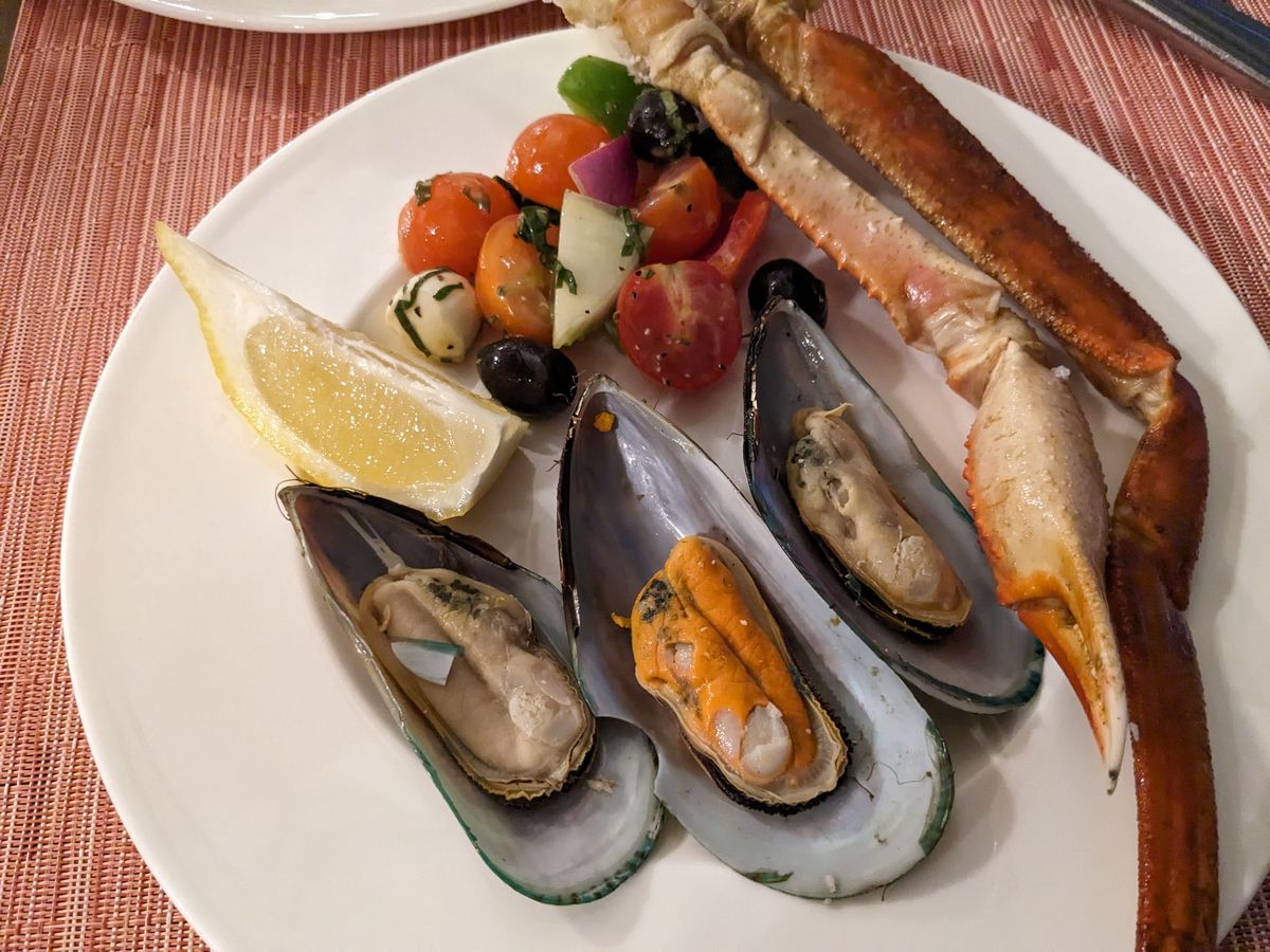 カニ、ムール貝が食べ放題です。ただ、カニ剥き用のハサミなどは置いてないので、食べるのに一苦労です。