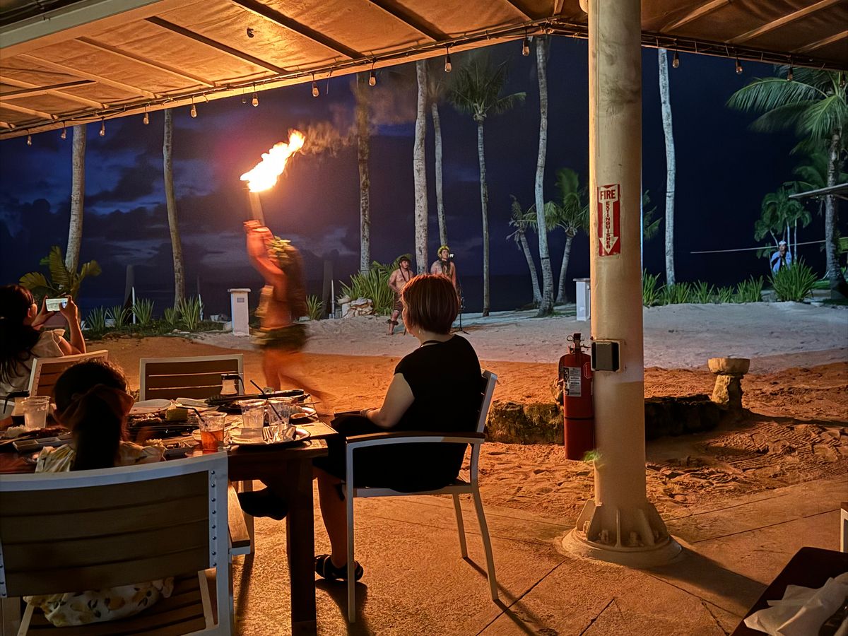 食事の量は多く、肉中心でした。質は良くて美味しかったです。ショーは南の島感が前面に出たファイヤーダンスで見応え十分です。ホテルでのディナーショー(ニッコーグアム)ということもあり期待通りでした。サンセットも最高でいい写真もたくさん撮れました。ファミリーにもカップルにもカジュアルな雰囲気で楽しめると思います。