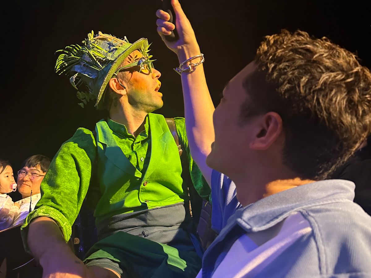 舞台から大幅にはみ出して会場全部を使った演出が多くてすごく面白かったです!写真動画撮影OKだったのも嬉しかったですし、まさかの旦那様が選ばれて?少しの間ステージにいきました!選んでいただき感謝ですし、すごくいい思い出になりました。あと、ロビー?待ち時間のところが煌びやかで写真が映えました!!!このショーは近くで見た方がおもしろいです!おわったあとキャスト様たちと写真が撮れたりファンサもすごかったです!