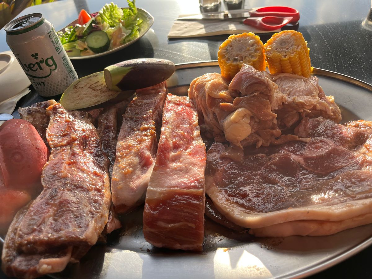 時期的に観光客が少ないのか、ガラガラで窓際の良い席にご案内いただきました。ボリュームがありそうだったのでお肉のみのコースにしましたが、私達にはそれでも多いくらいでした。前にきた時はグラスに入ったビール(ドラフトかは不明)でしたが缶ビールに変わってました。それでもキンキンに冷えていたので美味しくいただきました。お肉も最近の口コミ見ると少し心配でしたが、柔らかくて美味しかったです。