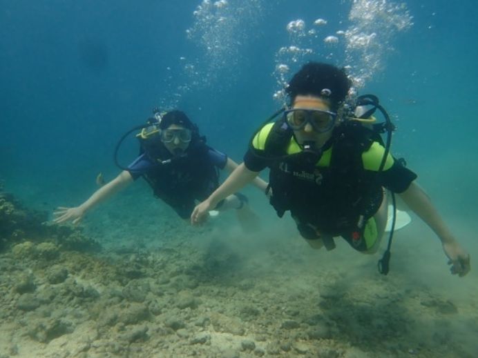 朝はホテルまでインストラクターの方が迎えにきてくれて、そのままダイビングショップでスーツと靴をそろえました。その後直接ダイビングスポットに行って、説明の後、海に入りました。説明は分かりやすく丁寧だったので、問題なくダイビングをすることができました。二回プランだったので、慣れてきてからもう一回できて、とても良かったです。海の中で魚の餌もあげられて、写真もたくさん撮ってもらえました。写真はその日のうちにもらえて、自分達のものだけでなく、海の中の写真など、たくさんもらえました。ただ、ダイビング後は着替えずそのままホテルに送って頂くので、羽織るものか大きなバスタオルがいると思います。