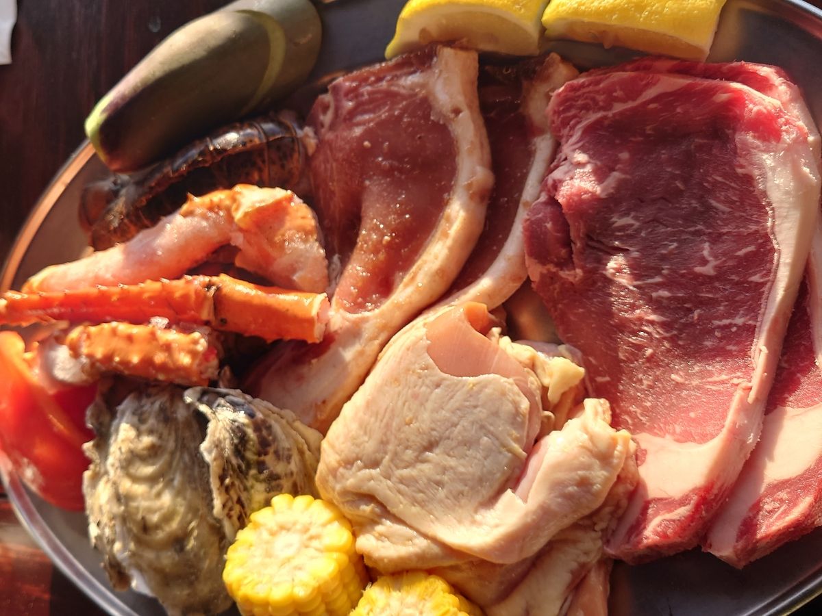 サーロインステーキ、ポークステーキ、チキンステーキ、タラバ、ロブスター、オイスター、エビ、赤パプリカやコーンなどの野菜がそれぞれ3人分でした。