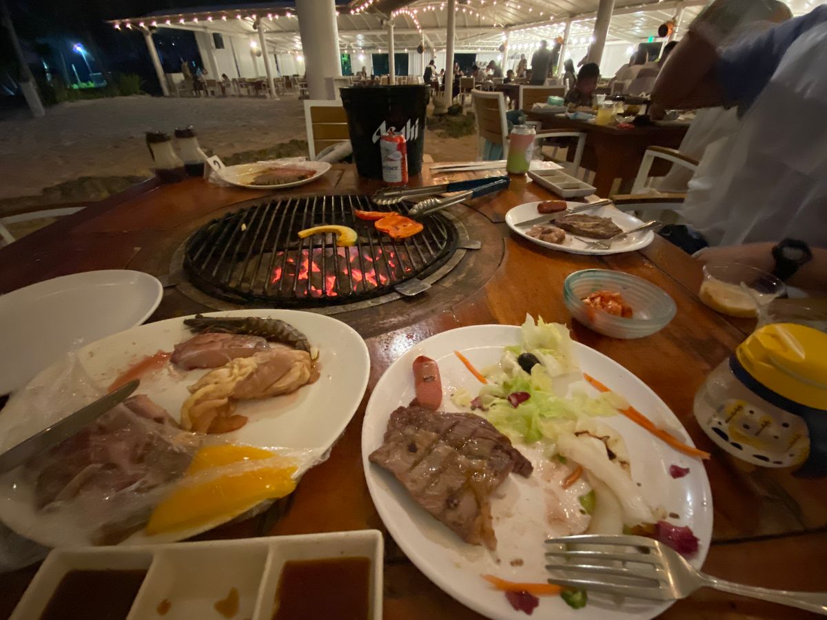 6時の予約で早く着きすぎたから、少し時間潰して数分前にお店に行ったら、すでに5組ほど肉を焼いていました。早く行った方がより良い角度で夕日が見れますよ!