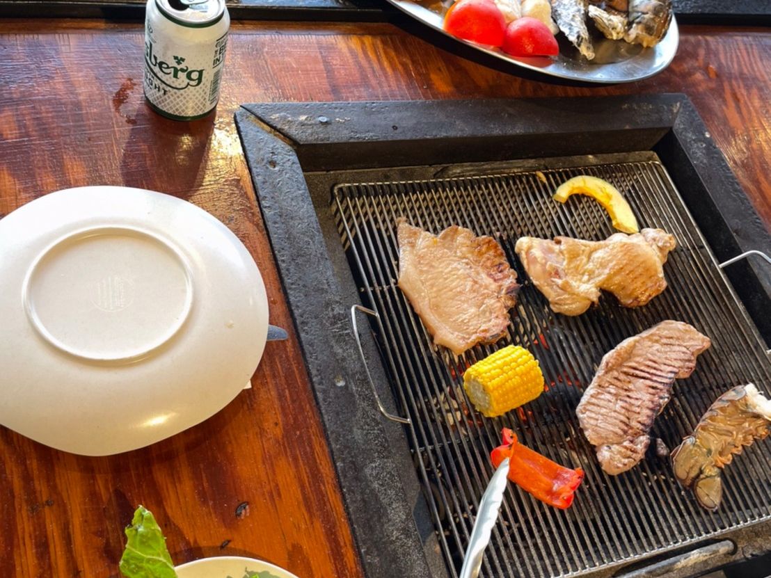 リザーブされた席はビーチに一番近い4人掛けで、炭火が準備済み、塩-コショウが置いてありました。