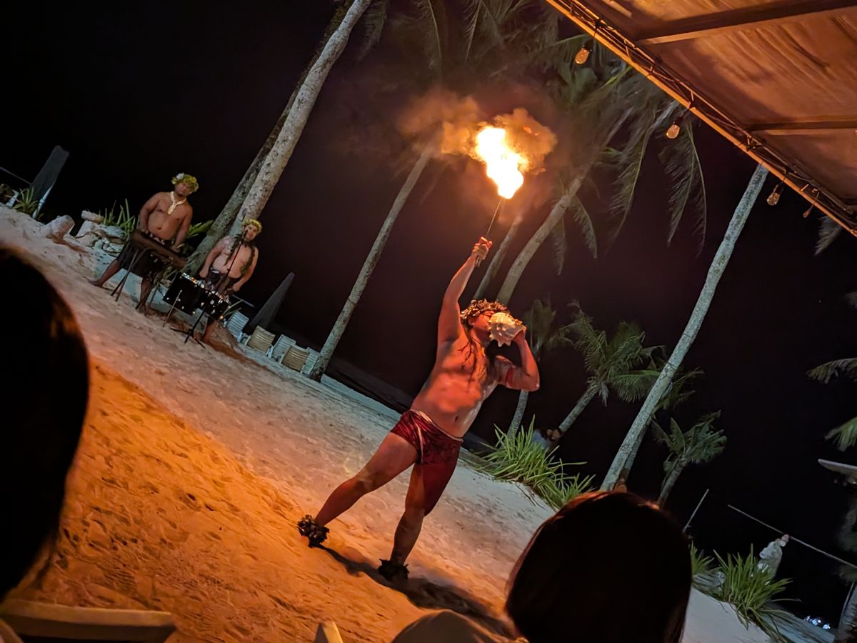 初めはとても火が熱く、また虫(ハエ)が多くて子供は苦手なようでした。とてもボリュームがあり、食べきれませんでしたが、ビーフもチキンも美味しかったです!バイキングでは、白米、サラダ、素麺、蒸しポテト、とうもろこし、フルーツがありました。日が暮れた頃にファイヤーダンスが始まり、皆さん釘付けで観てました!