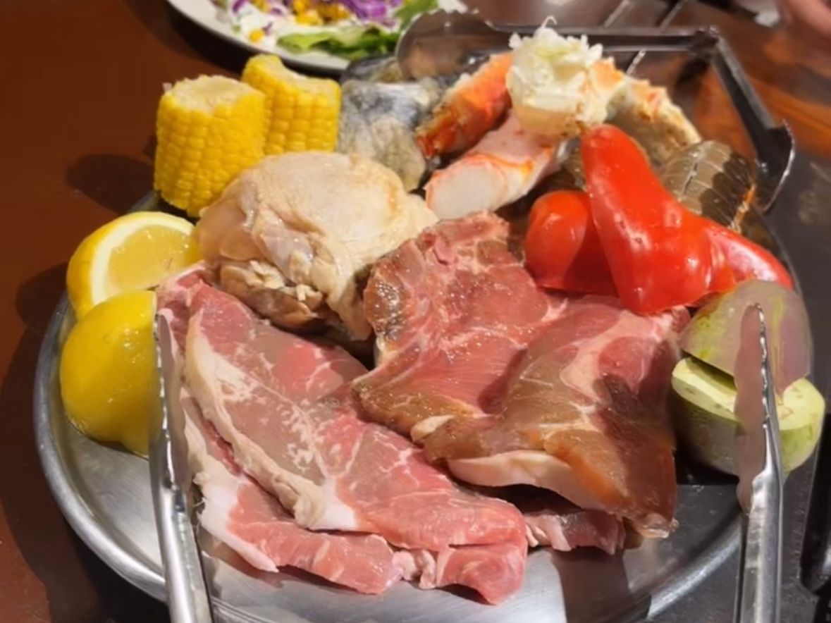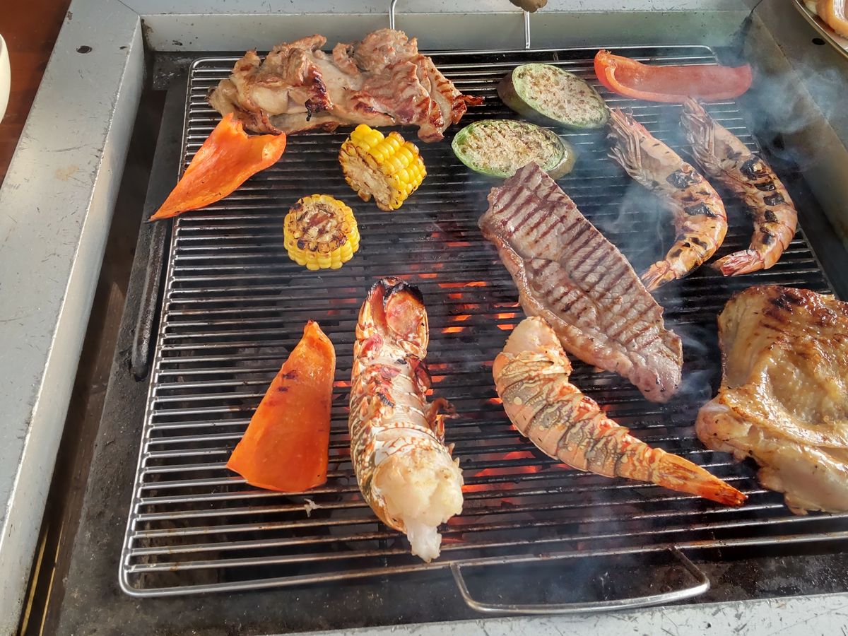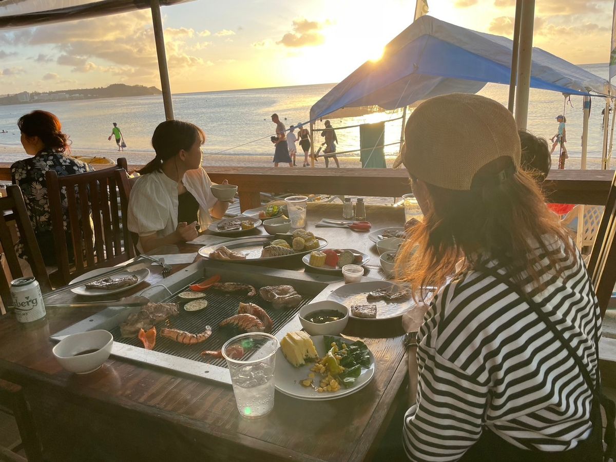 事前の予約のおかげでスムーズに席まで案内されました。18時からだったので、焼き始めてしばらくしていると日没の時間になり、そこら中で皆さん写真を撮っていました。お肉や海鮮も美味しかったです。野菜やスープなどはバイキングで食べ放題です。飲み放題なので、気候とバーベキューの暑さでも安心して頼むことが出来ます、スタッフも「飲み物おかわりは?」と回ってきてくれて助かりました。また、子どもにもとっても親切なスタッフでした。場所も中心街にあるので、終わってからもショッピングを楽しむことができます。 場所も味も良いので、グアムに訪れる度に必ず行ってます。