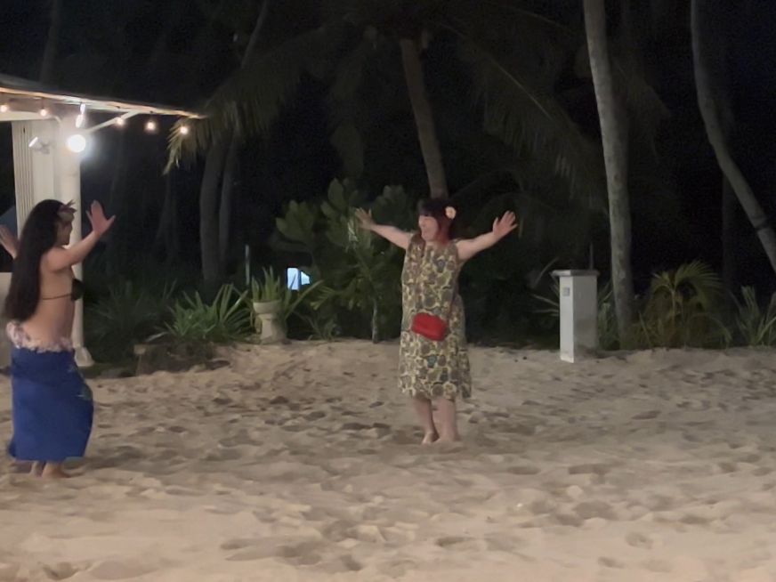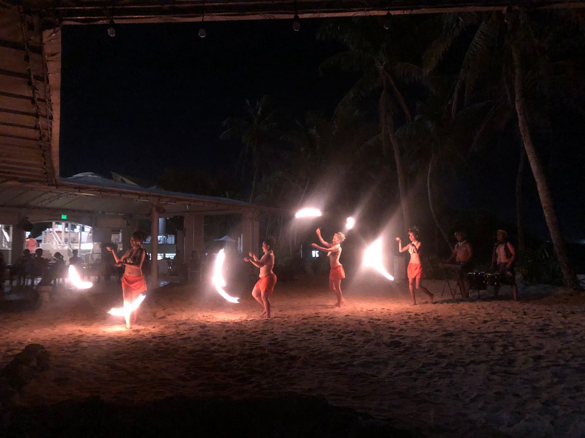 ひとり参加なので不安があったのですが、BBQもファイヤーダンスも問題なく楽しめました。場所柄、幸せそうなハネムーナーも多数参加してますが見ないようにしてれば気になりません。受付時にグループごとに指定されたテーブルに着席して、BBQとその後のファイヤーダンスを楽しむようになってます。飲み放題の缶ビールはバケツの中に6本が氷水で冷やされてましたが、飲みきれませんでした。肉と料理は追加しなくてもお腹いっぱいになりました。