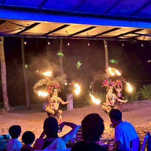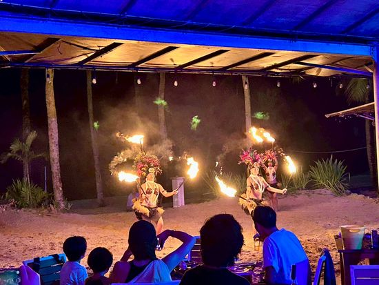 食事をしてから60分ぐらいしてファイヤーダンスショーのはじまり。迫力あって良かったですよ。ただショーは30分ぐらいで終わり、残り時間は、お誕生日の方が会場に何人かいまして、その人たちと踊ってました。あとは参加型のダンス、最後は順番に並んで記念撮影。で、ホテルまで送ってくれました。