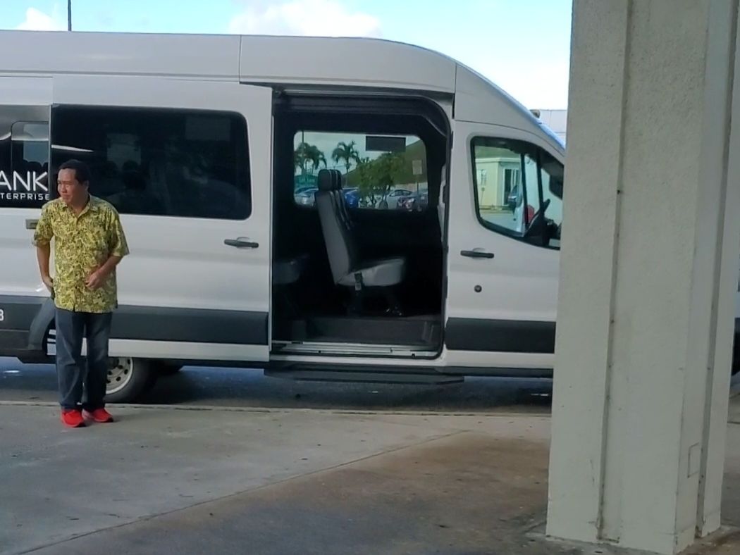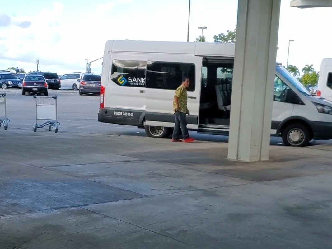 3年前にもこの送迎シャトルサービスを利用させていただきました。グアム空港到着後の税関検査の出口は1カ所で、ガイド兼運転手さんは出口のところで待っていました。自分の名前が書かれた紙を持っており、迷わずすぐに会えました。写真のような黄色いシャツを着ていましたのでそれが目印です。バスではなく、バンタイプの車で空港からタモン地区のホテルまで快適に送迎してくれて良かったです。