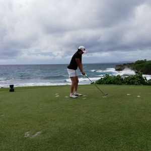 スタート前はスコールにあいましたがスタートを少し送らせてプレーしました。強風で大変ですが、綺麗な景色の中プレーできるので良かったです。