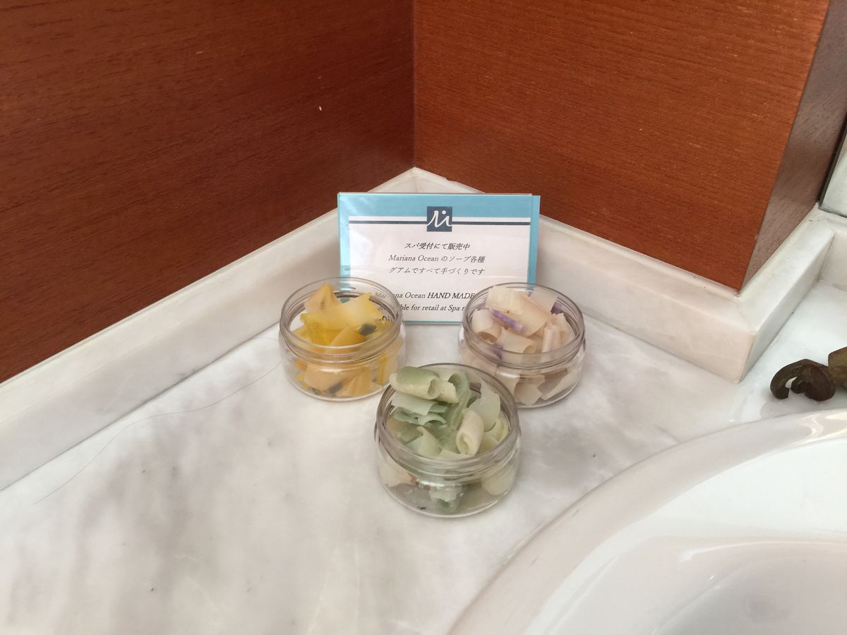 お手洗いや各部屋の水回りにサンプルをご用意しておりますソープは、グアムで手作りされているマリアナオーシャンというブランドのものでございます。
