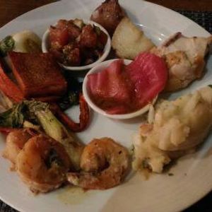 お刺身、カニ、エビ、ムール貝、サラダ、カレー、ローストビーフ、ラーメン、中華炒め等など、私はガーリックシュリンプみたいなちょっと味付けは違いましたが美味しかったです。