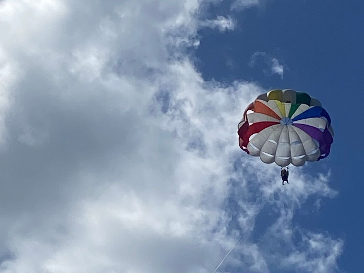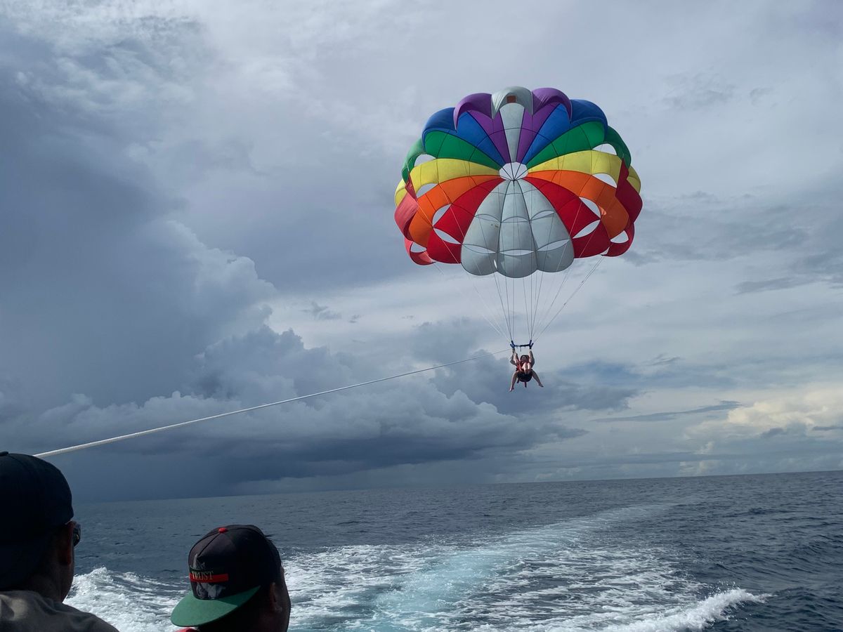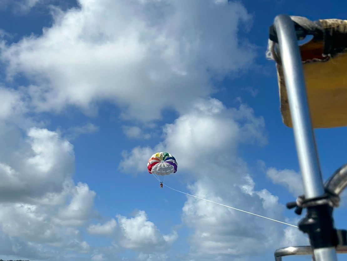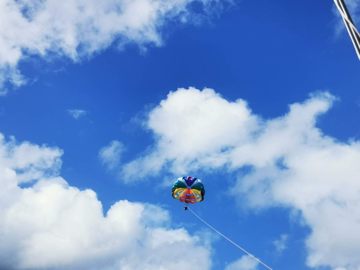 集合時間にホテルにお迎えに来ていただき、まず最初にパラセイリングの場所まで移動、船に乗って沖合に出て空へと飛びました。パラシュートが開いて後ろに飛んでいき、上空から海や景色を眺める体験は貴重で楽しかったです(振動があるので、腰の弱い方や痛めている方はお気をつけて!)