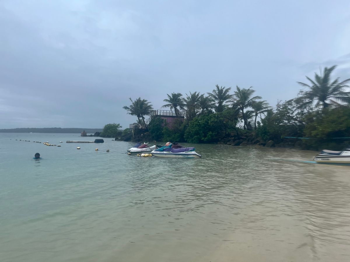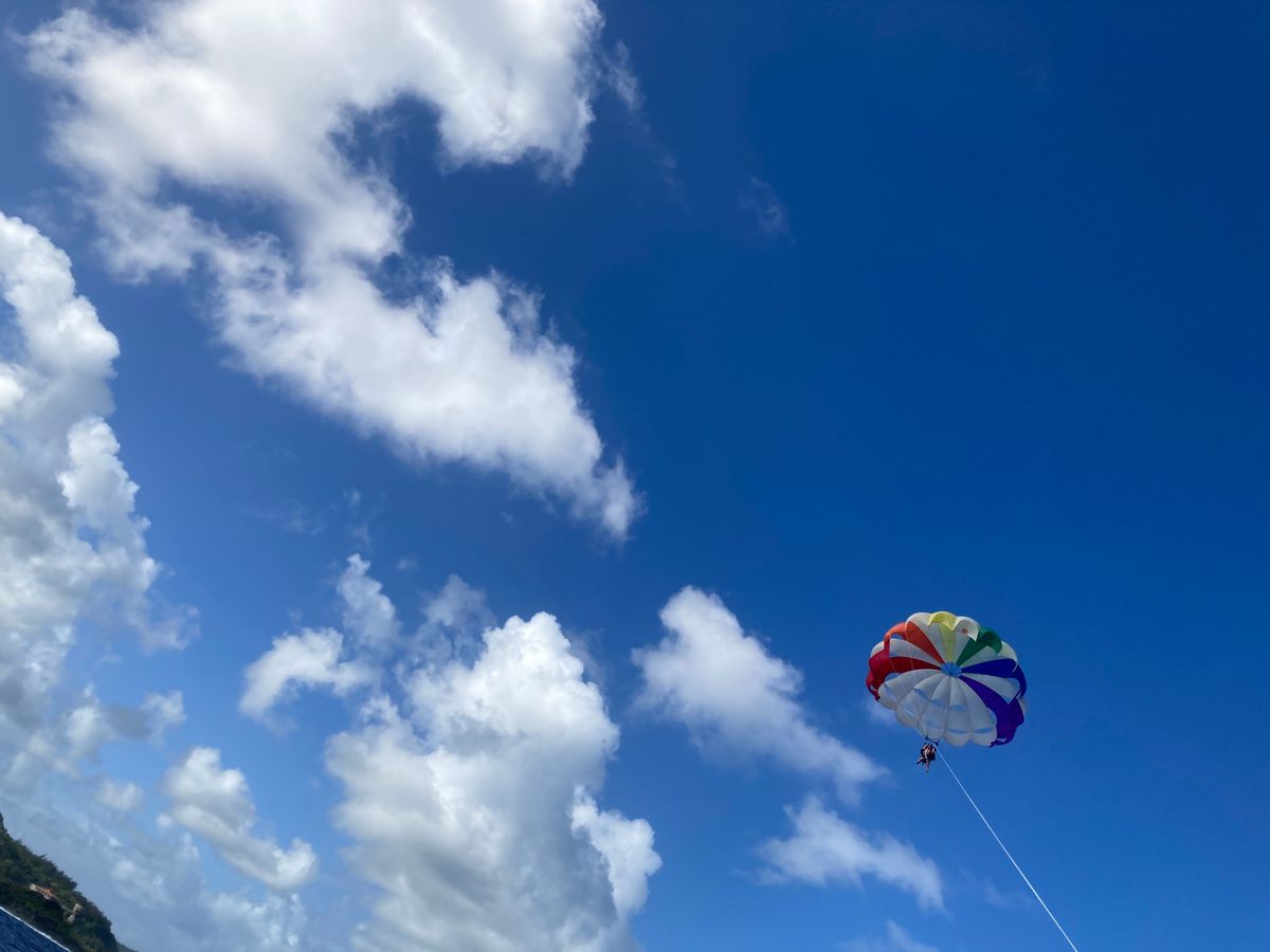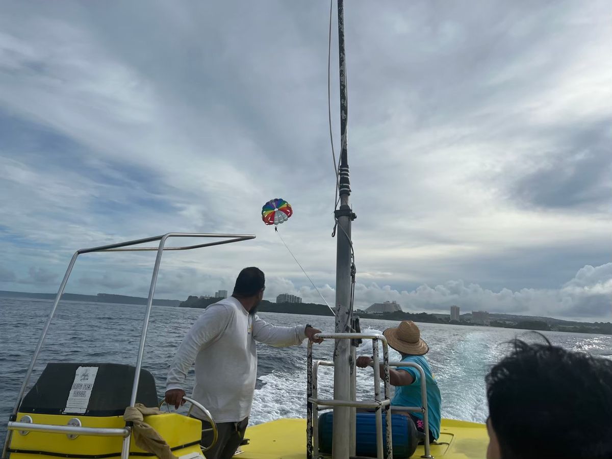 ホテルから直行でパラセーリングが出来る港に行きます。この時点で土砂降りだったにも関わらず決行する雰囲気だったので、始まるまでは同行者と恐怖と寒さで震え上がっていたのですが、一瞬の晴れ間を縫って参加することができました!私は高所が苦手なので、序盤や揺れた時はかなり怖かったのですが、それでもグアムを空から一望した景色は忘れられません。終わった瞬間からまた雨が降り出したので、現地の方の天気を読む力は凄いなと思いました。