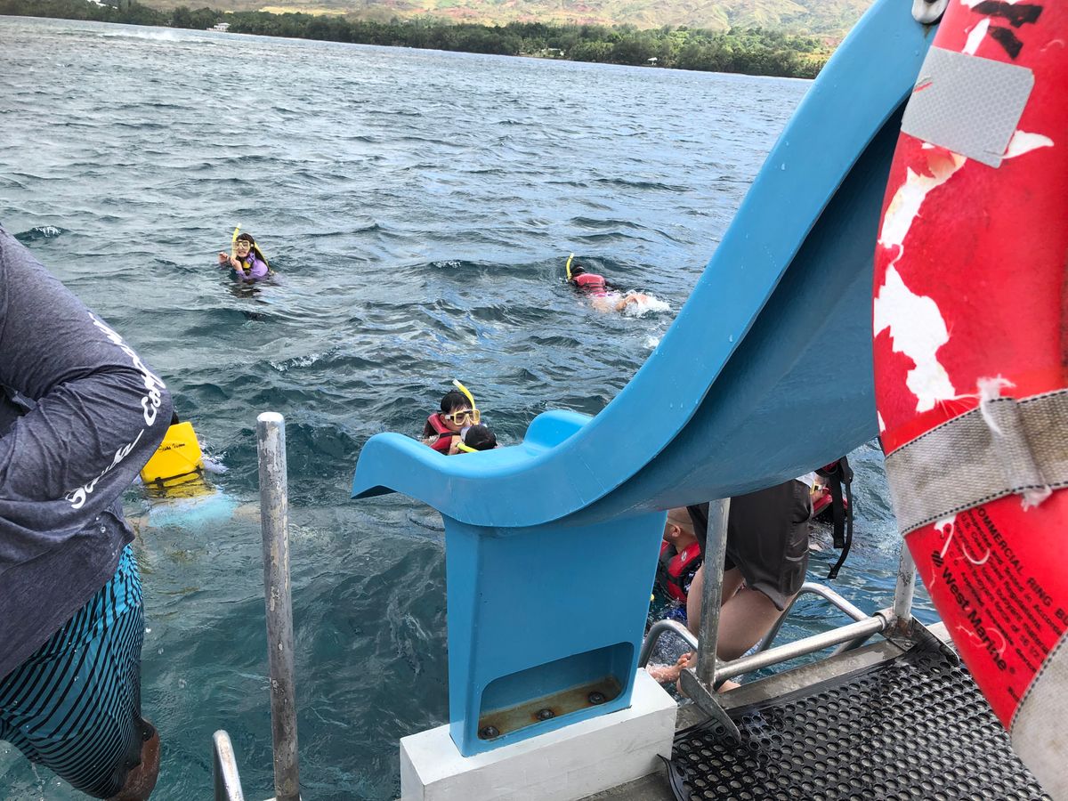 小学校1年、3年と妻とで4人で参加しました!足が届かない海が怖いと言っていた娘達の心配はどこへ?と言うぐらいシュノーケリングを楽しんでいました。滑り台もトライしました!スタッフの皆さんが楽しく優しく、安心して楽しめました。野生のイルカもすぐに見れました。子どもも大人も大満足!お弁当も日本人好みの味付けで、辛くもなく子どもも食べれました。子ども達に一生忘れない思い出になったようです。