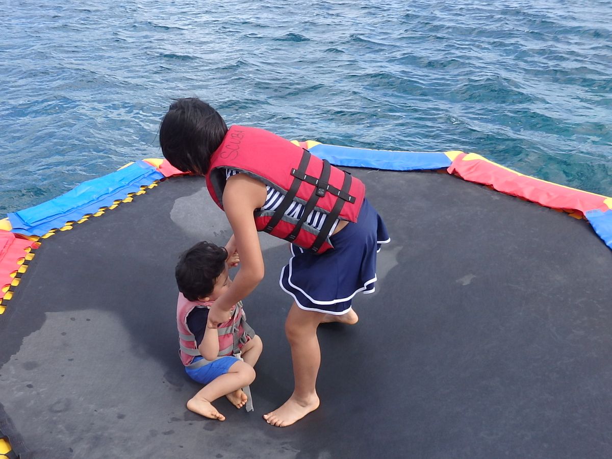 そのあとはトランポリンや滑り台、シュノーケルの時間になりました。6歳の子供は足の届かない外洋に入るのを怖がっていましたが、トランポリンで気持ちがほぐれたようで無事にシュノーケルも出来ました。魚の数が凄かったです。綺麗な熱帯魚ばかりでとても夢中になりました。