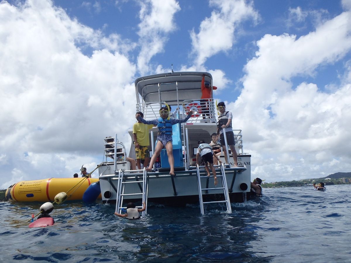 船で15分くらい、野生のイルカがたくさん見れました。船の後を追って一緒に泳いでくれて大興奮でした。イルカを見た後はライフジャケットを着用して、海へ。9歳の息子は船の滑り台からドボーンと入って楽しそうでした。海なのでロープを掴んでないとすぐ流されてしまうのが少しこわそうでしたが、シュノーケルで海の底まで見えて喜んでました。船へあがってお弁当タイム。ソースカツ丼はおいしかったです。ジュースも飲み放題なのか、子どもはたくさんもらってました。船の中にはトイレもありました。スタッフの方はカタコトの日本語でたくさん説明してくれました。お客さんは基本的に日本人か韓国人しかいないです。