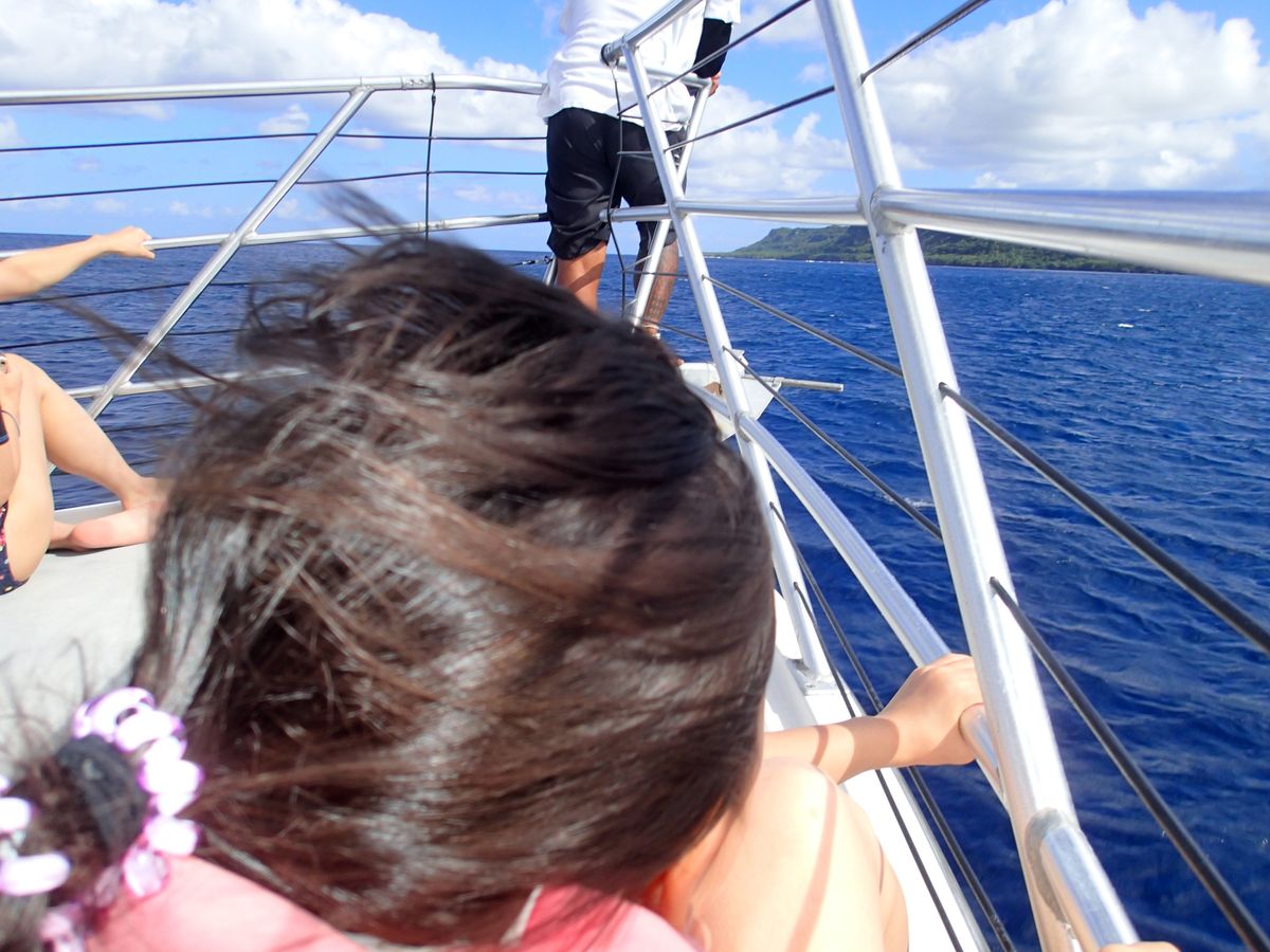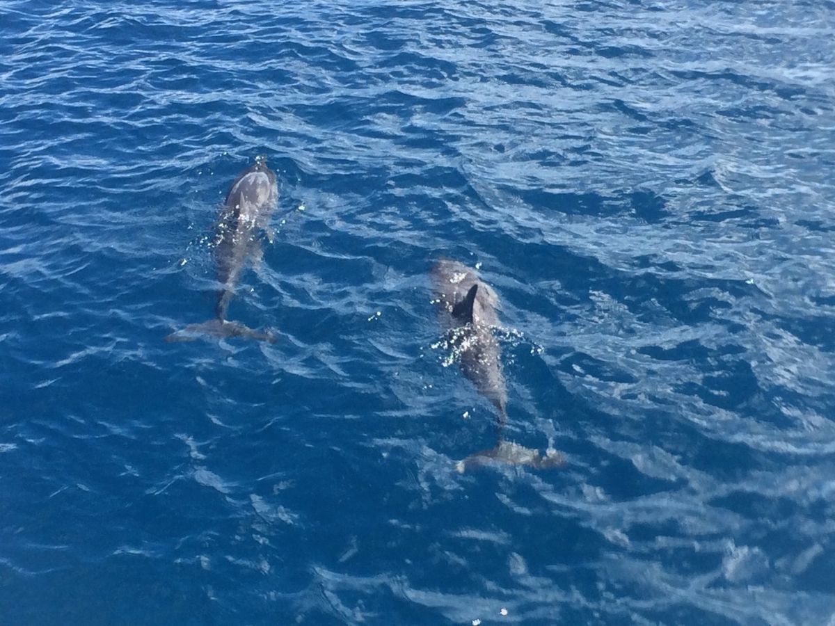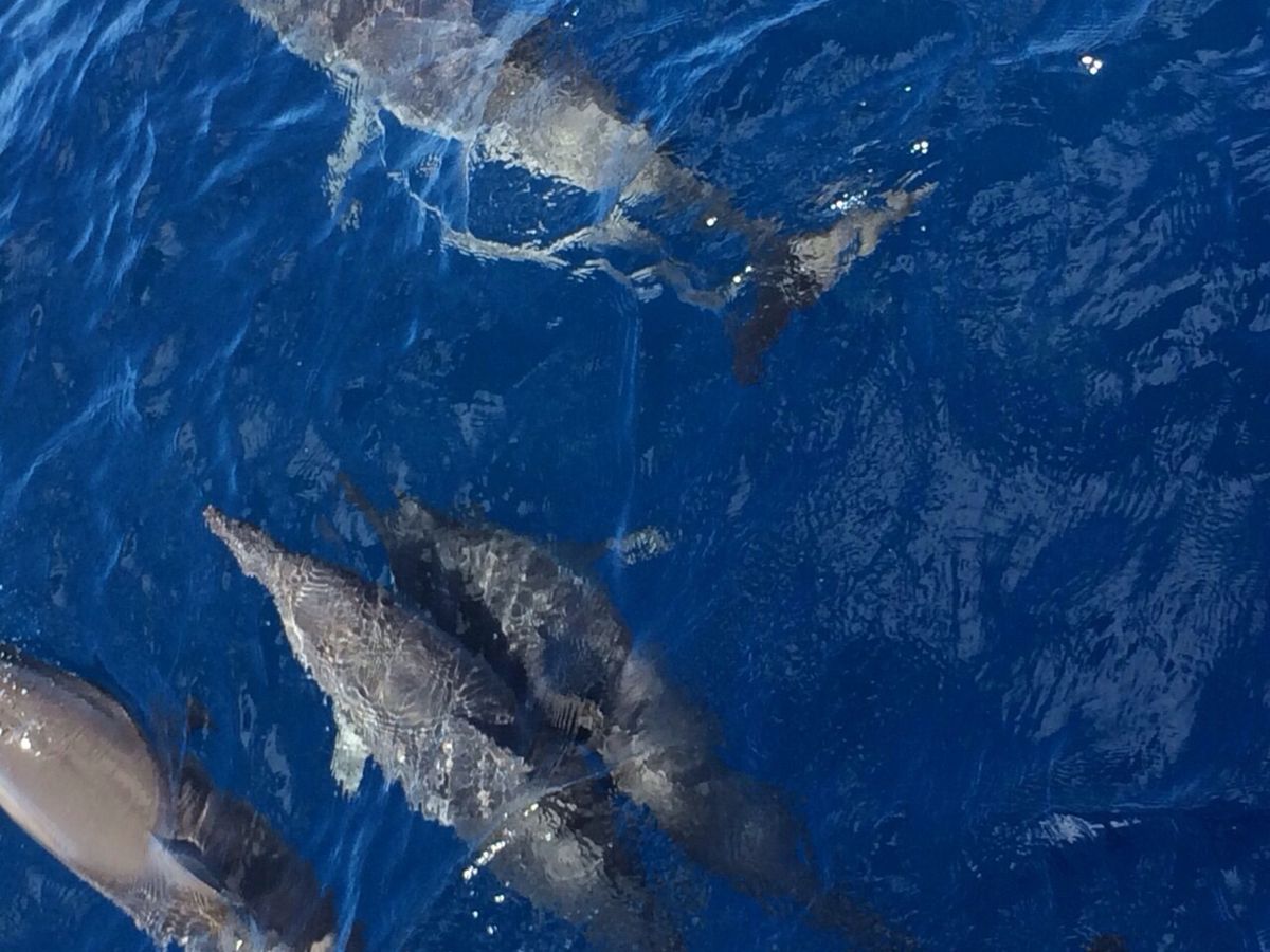 見つかったイルカは数頭とかじゃなく、数十匹群れになって船の真下を泳いでくれて、水族館のようにジャンプ!したり、宙返りしたり、中には赤ちゃんと連れ添って泳いでいるイルカもいたりと、ずーっとステキな時間を過ごせて楽しかったです。
