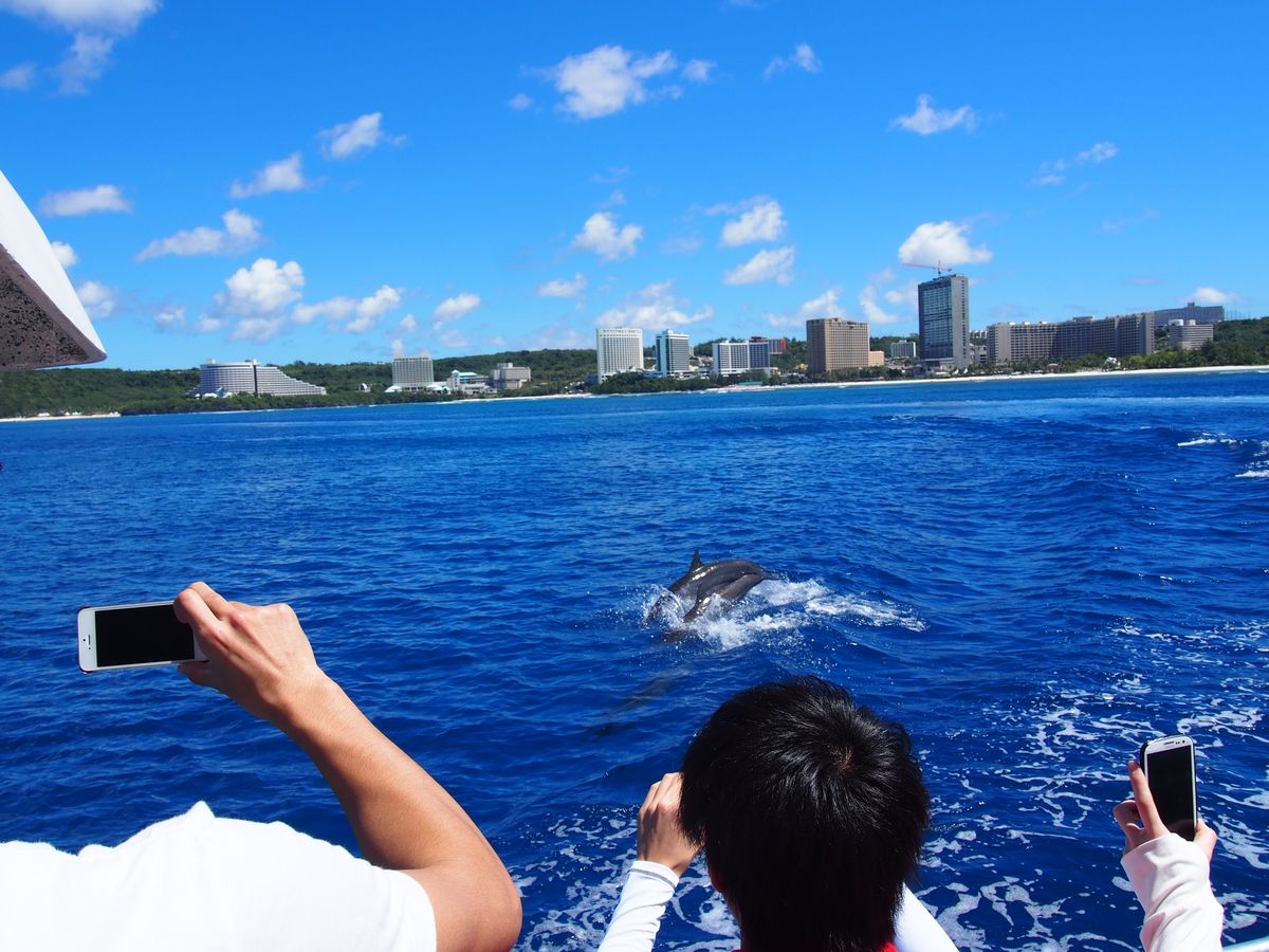 船に乗るまでのバスの中で、ガイドさんがいろいろなグアムの楽しいお話、ツアーの話をしてくれました。イルカに出会えるまでは不安もありましたが、早々に…たくさんのハシナガイルカに遭遇できました。赤ちゃんイルカがかわいらしくジャンプをする姿を何度も見ることができ感動でした。