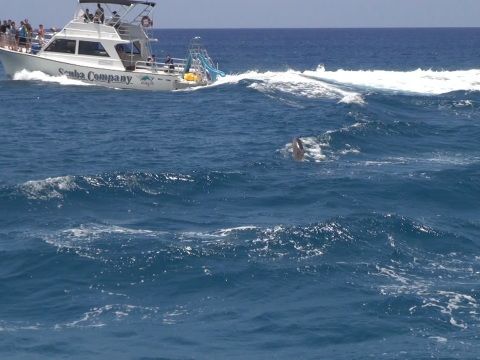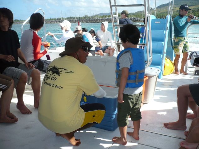 何度かグアムに行っていますが、イルカを見るのは初めてでした。船をうまく操縦して、イルカがはねることころを見せてくれます。また、パンを渡してくれるので熱帯魚に直接餌をやることができます。参加した家族は大満足でした。