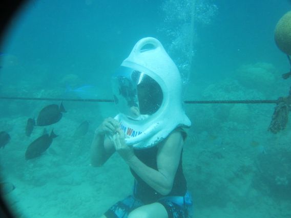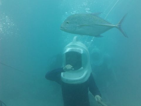 大きなヘルメットをかぶり顔が濡れることなく、水中を歩くことができます。ときどき耳の空気抜きは必要ですが、簡単に綺麗な水の中を見て、触れることができます。