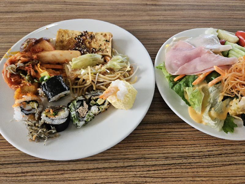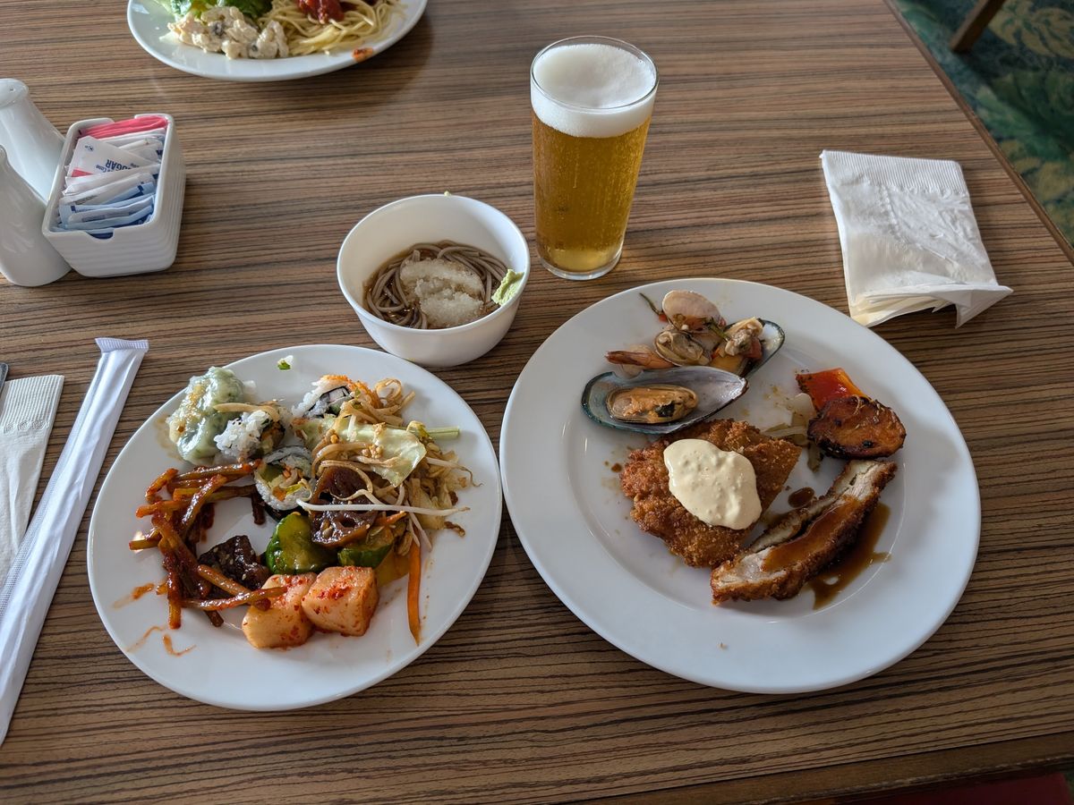 昼食はブッフェスタイルでした。子供から大人まで満足の品揃えでした。デザートにアイスやケーキが用意されており、子供が非常に喜んでいました。食事自体も美味しく、全員満足の内容でした。