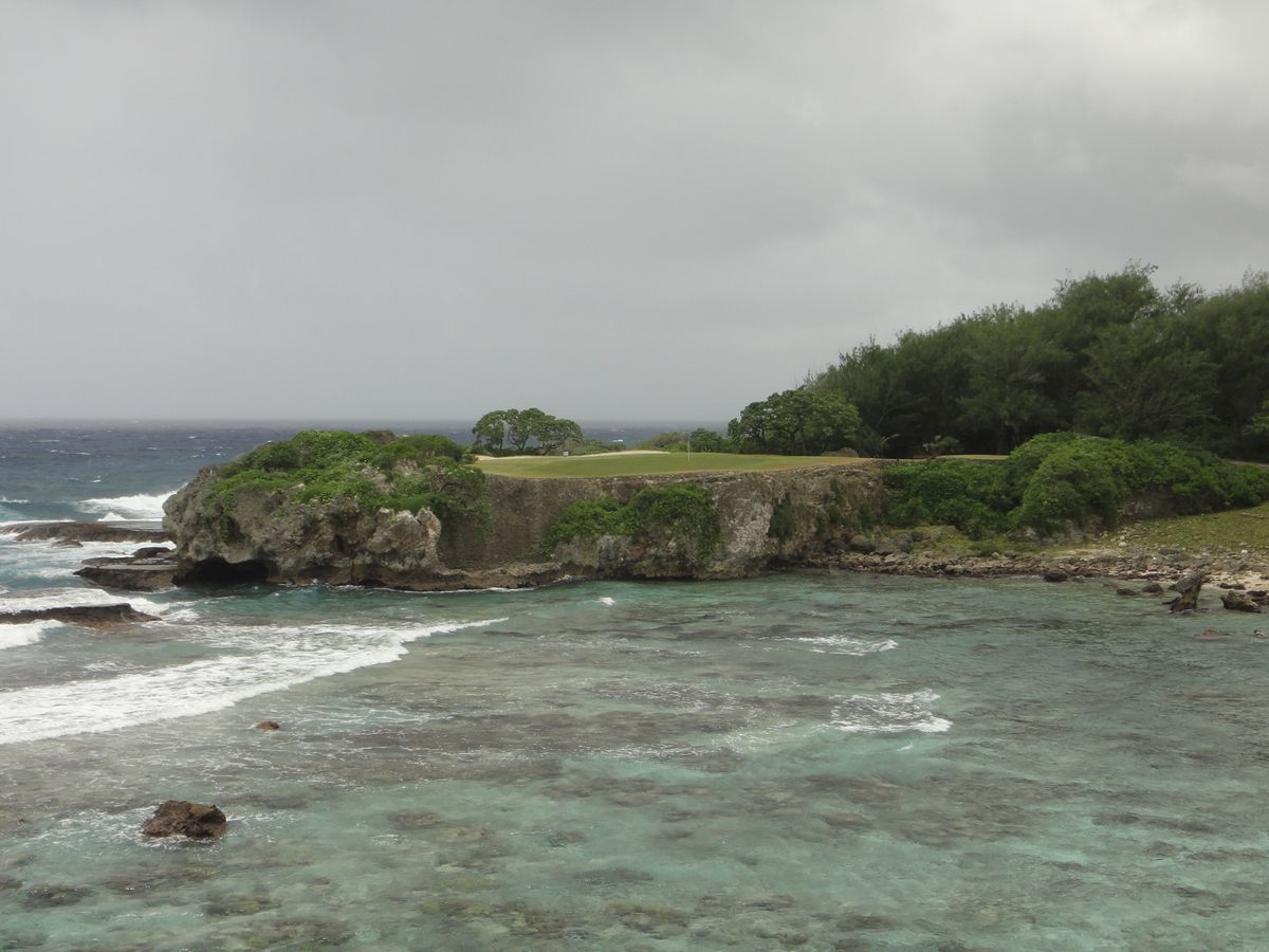 今回は曇りのち晴れで、インスタートの海の色はイマイチでしたが、暑くなく、楽にラウンドできました。ハーフ後は毎度詰まるようなのですが、スタート前にレストランで買っておいたスパムむすび(4ドル)を食べながら待つというのが、小腹の空いたお腹と時間潰しに最適でした。最終ホールのグリーンでスコールが降り始めましたが、用意しておいたウィンドブレイカーを着るほどでもなく、ラッキーでした。