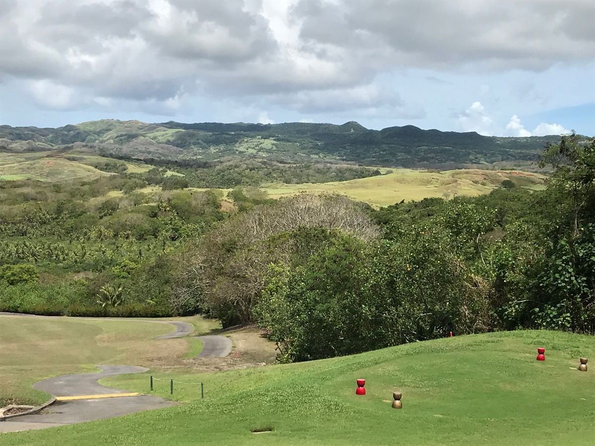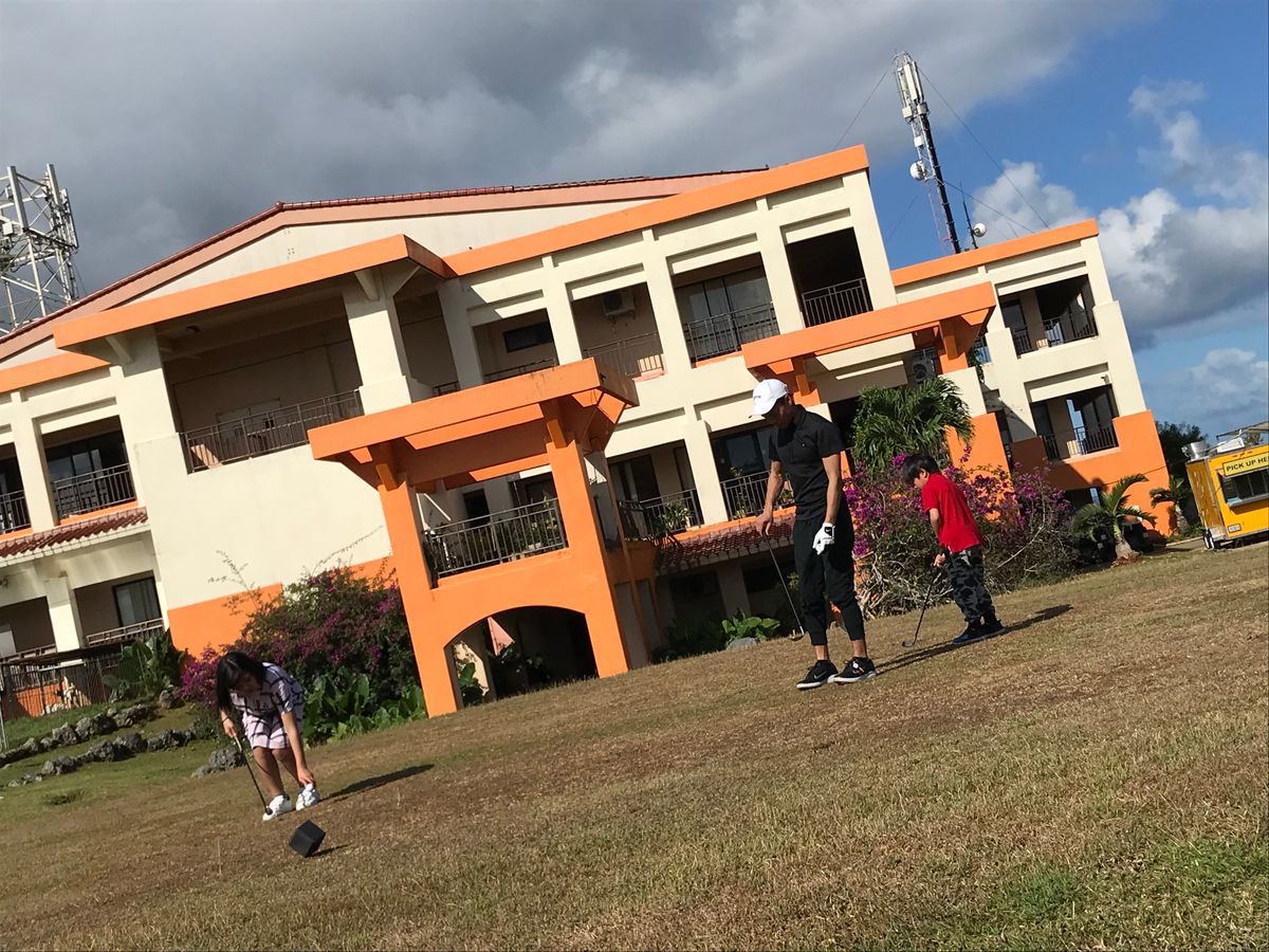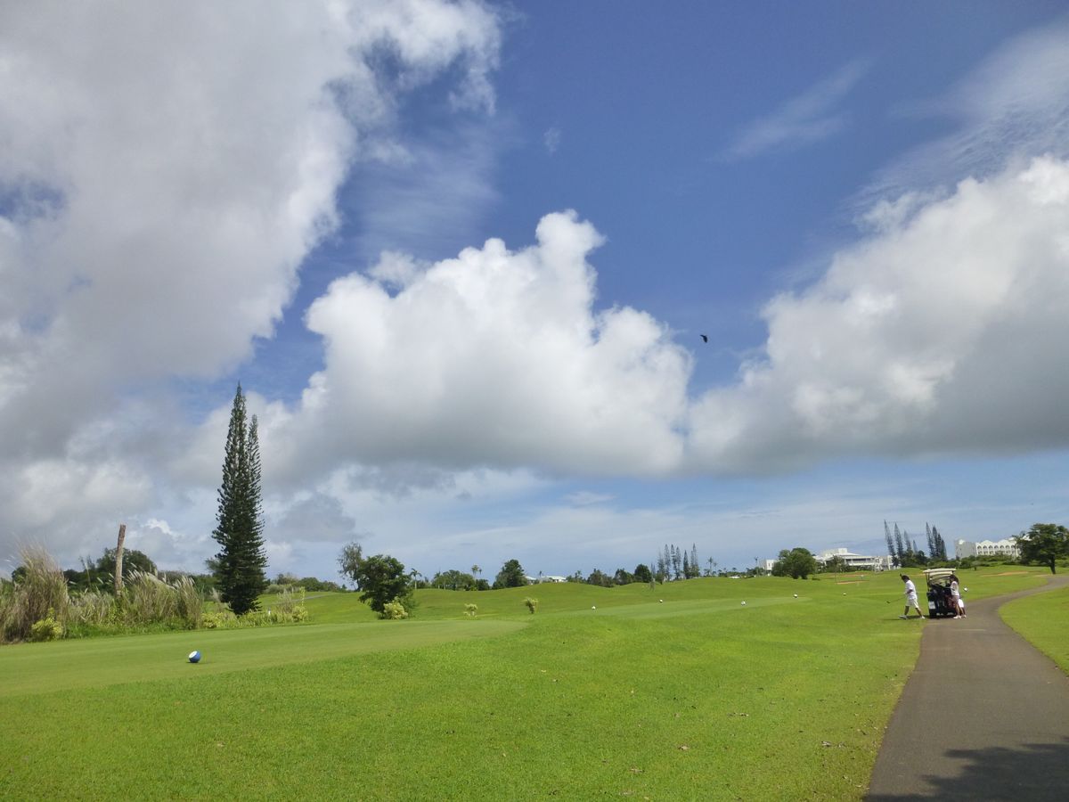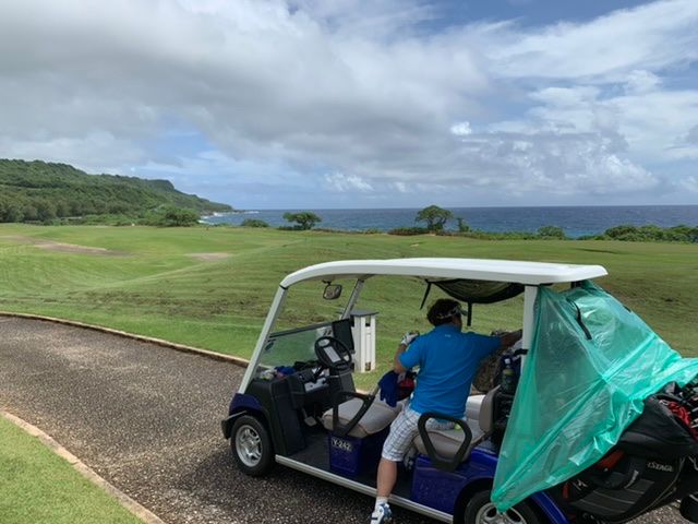 1日目タロフォ。あいにくの曇り時々雨。空いていて、ゴルフデビューが1名いましたが、ゆっくり回れました。ラフが激しく、大きいカエルがたくさんいたので、なるべくフェアウェイに置きたいところです。お昼はスパムを注文したので、コースまで持ってきてくれます。出来立てで温かくおいしかった。送迎の方も丁寧な運転でした。スタート前に練習器具が体験できたのがうれしかったです。