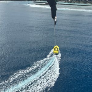 初めてのパラセーリングに家族4人で参加しました!ホテルに時間通りにピックアップに来てくれ、メインのビーチリゾートに立ち寄った後、私達はパラセーリングのボートの港へ移動。説明を聞いて、早速ボートで出発!少し沖へ出たところでいよいよパラセーリング。2人乗りで一気に空に飛び立ちました!最初は少し不安でしたが、飛び立った瞬間、気持ちいい〜‼︎美しい海の色、海岸の景色、本当に最高でした。初めてで迷われている方に是非お勧めしたい体験です。息子2人(大学生、高校生)もとても楽しかったそうです。ありがとうございました!