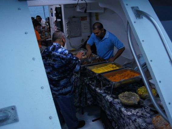 実際は、クルーザーに長いテーブル、事前に調理された料理が用意されており、ビュッフェスタイルでした。