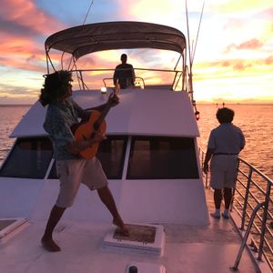 まずサンセットクルーズ 太陽がだんだん沈み綺麗な夕焼けの中おもむろにキャプテン(サミーさん)がクラシックギターを取り出し地元の歌を披露 素晴らしい歌声です 今回参加者が2組と少なかった為大きなクルーザーは貸切状態 夢のようなクルーズが終わり