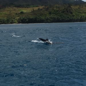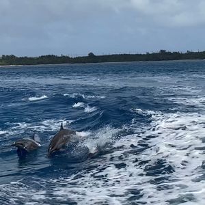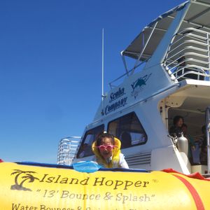 イルカのいるポイントまでしばらく船は高速移動、私たち以外にも何艘かそのポイントにいます。運良く私たちの船の通ったあとに出来た波に乗ってイルカが群れで10頭ほど泳いでジャンプを見せてくれ、まじかでそれが見れて本当感動ものでした。その後船は少し移動してトランポリンや滑り台、シュノーケルをして港に帰りました。