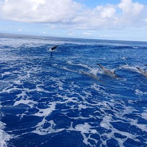 他のイルカウォッチング船が波を作るために何度も円を描きながら航行し、子供を含むイルカの群れがその波でスピンジャンプしながら遊ぶという最高の光景をじっくりと堪能できました。