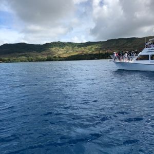 グアム旅行で唯一参加したツアーでした!結果は大正解!その日はラッキーだったのかイルカの大群に会えました。船の後ろをイルカ達が追いかけるようなかたちで何度もジャンプが見れ大興奮!帰りにウミガメも見れるといいねーと話してたそばからなんとウミガメ!船の近くに呼吸しに上がってきてあっという間にまた潜っていきました。本当にラッキーだったんだと思いますが、良い天気のなか船に乗るのは気持ち良く、ヒロさんの心使いもありとても楽しめました。お弁当は帰りに渡されるスタイルです。チキンカツ弁当美味しく頂きました。