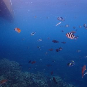 シュノーケルの為に船の下は餌を撒いて居るので魚がいっぱい居ます!