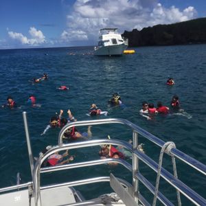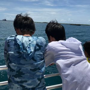 年長、小学三年生の子供含めた家族四人で参加しました。イルカウォッチングは案内役の方によると、船で出発して平均20分くらいで見つけることができるそうです。私達も多分それくらいでイルカ達に出会えました!すごく可愛らしくて、子供も大変喜んでました。その後のシュノーケリングもたくさん魚が見れて大満足です。たまたま海ガメも一瞬見る事ができました!気をつけた方良い点は2点!①予約を日本で直前にすると、グアム到着後に返信が来るため、早めの予約の方が安心です。②酔い止めは飲んだ方が良いかもしれません。