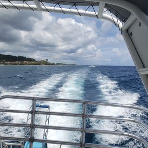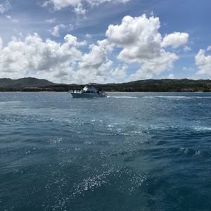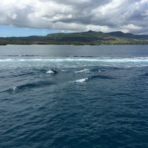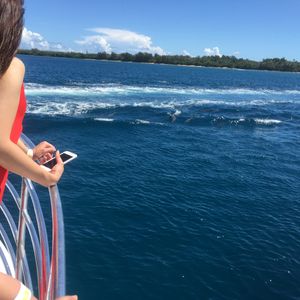 イルカツアーは15人くらいが乗れるクルーザーで行きました。座る場所によっては少し水がかかります。天気が良かったので風がとても気持ち良かったです。イルカウォッチングのポイントに着くと他のイルカツアーの船も何艘か来ていて、すぐに沢山のイルカが見れました。船が走って起こす波でイルカが遊ぶようで、他の船とやりとりしながら交互に船を走らせ、私たちは他の船が起こす波で遊ぶイルカを見たり、自分たちの乗っている船に並走するイルカを見たり…とにかく沢山見れました!船長さんは目があるようで、ぱっとあっちだこっちだと教えてくれますし、帰りには亀も見つけてくれました。あと、グアムの方はみなさん子供に優しいです。