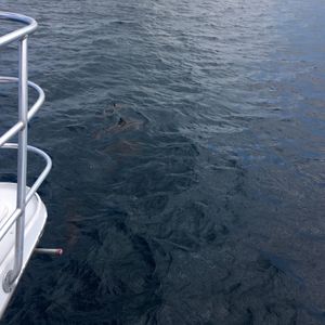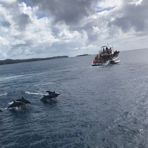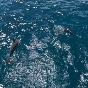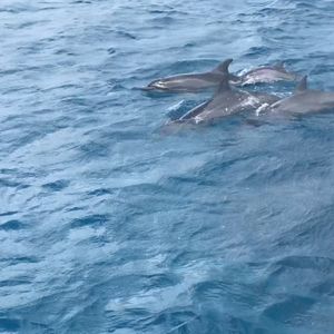 最初は、遠くの方にイルカの群れを見たと思ったら、近くに別のイルカの群れが♪ただ、のんびり泳ぐイルカを見る時間が長く、私が想像していた船のそばをピョンピョン飛ぶ姿は少ししか見れませんでした。それでも、私が乗った船が一番船を走らせる時間が多かったので、後ろから楽しそうについてくるイルカたちを見ることができました。同じツアー内容ならこの会社の船に乗ることをお勧めします。