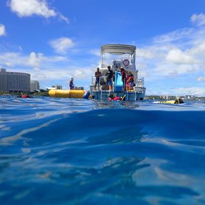 グアムは世界でも有数のドルフィンウォッチングポイント!ハワイと同様にどのツアーも高い遭遇率を誇ります。群れで泳ぎ人間のことに興味津々なイルカたちは、船に近づいてくる程の人懐っこさをもっています。イルカたちはボートの作り出す波が大好きで、波乗りしたり、ボートと伴走したりして、まるで私たちを楽しませるかのようです。さらにボートできれいなグアムの海を縦横無尽に走って快適な海風やクリアな波を感じられるのもおすすめポイント☆ツアーにはイルカウォッチングとともにマリンスポーツや、赤ちゃんや子供に大人気のトランポリンなどが楽しめるものもたくさん!シュノーケリングやパラセーリングも一緒に楽しんじゃいましょう♪