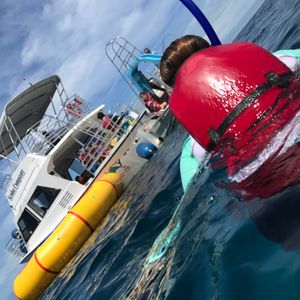イルカウォッチングの後は、クルーズの滑り台から海に飛び込み、シュノーケリングをしました。
