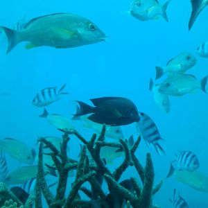 岸からロープを伝って歩いて潜っていくので、そんなに深いところではないのですが、大丈夫そうだとなると、我々3人をロープから手を放して泳がせてもくれました。