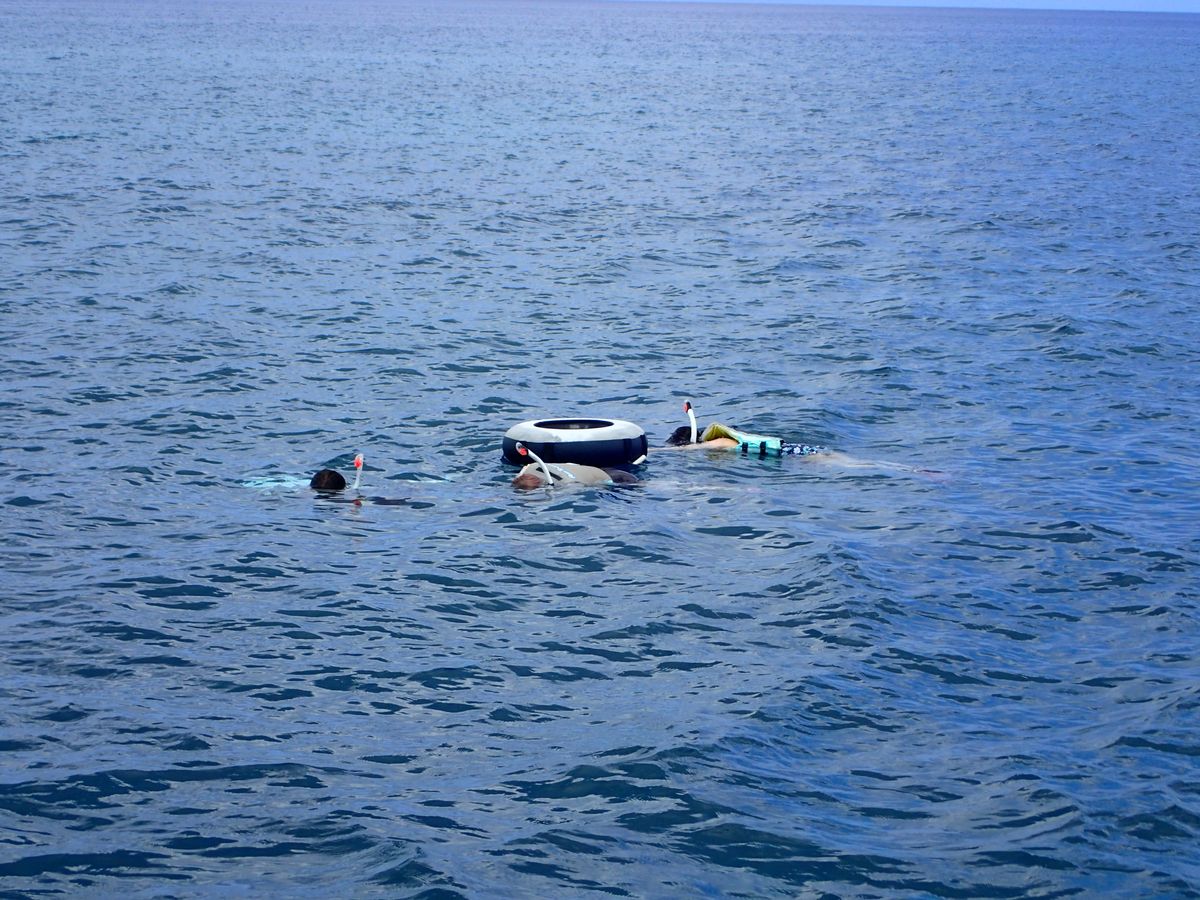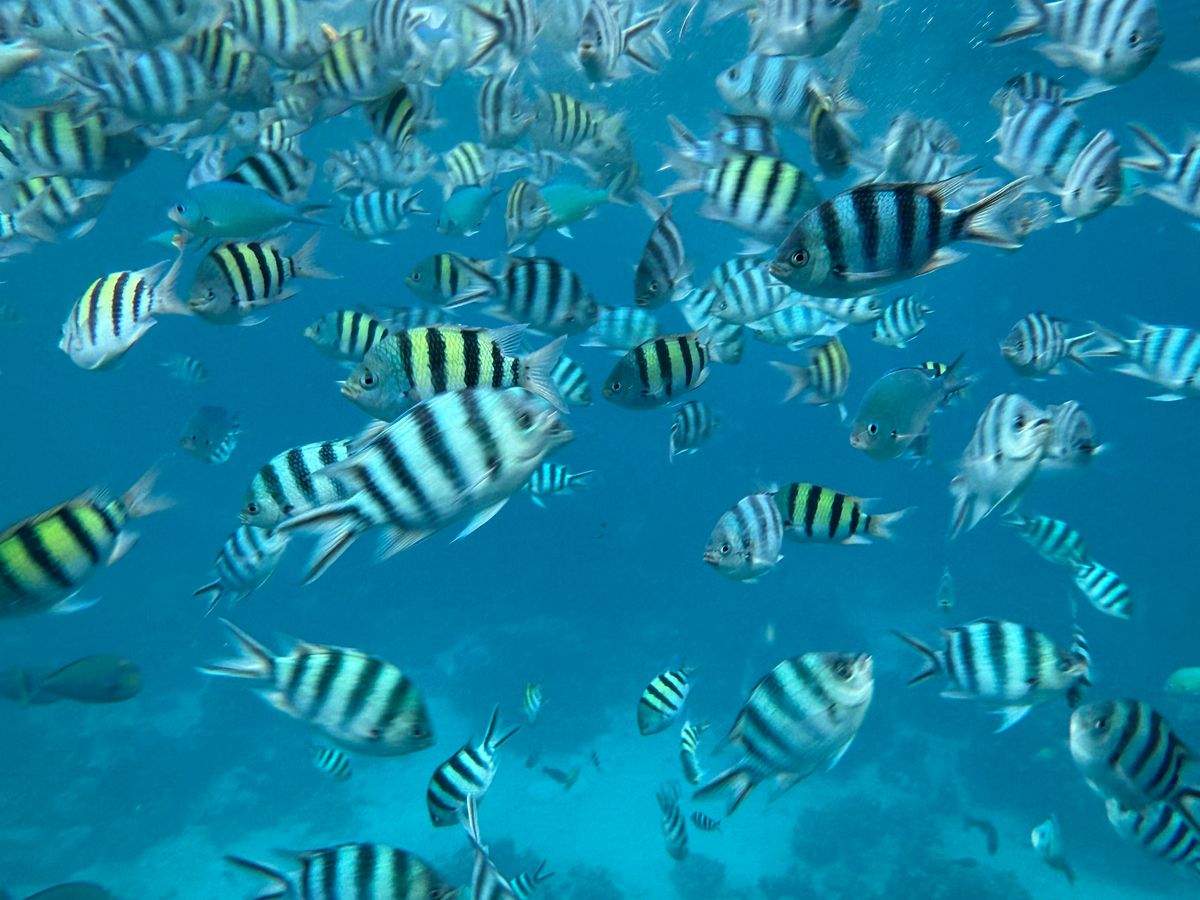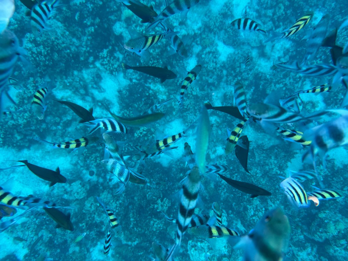 シュノーケリングはソーセージをいただけたので持って海に入ると、すぐに魚たちが待ち構えていました。船があるとエサをもらえるとわかってるようでした。