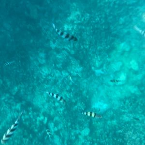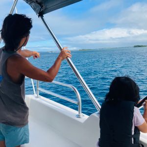 現地の方二人で20人弱くらいを乗せて船で出航!島の南部に向かいました。イルカポイントですぐにイルカは見つかったのですが、イルカがかくれんぼモードで顔を出しては隠れることをくり返し…。笑 諦めずに船をまわしてくださり、イルカとかくれんぼを楽しみました。が、その間に船酔いした息子はダウン。その後の海遊びに息子は参加できず、大人だけ少しスキューバをしました。深い海の底まで見えるくらい海が澄んでいて、たくさんの魚に会えました。