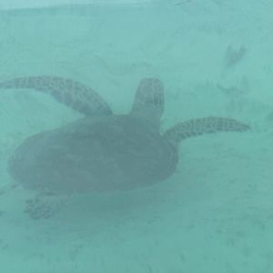 ウミガメウォッチング…穏やかに進むボートに乗ってウミガメがいるエリアへ。と言ってもシュノーケルエリアからすぐでした。あ!あれウミガメじゃない?から、え?あれも!こっちも!と10匹くらい見れました。ただ、ボートの上から水中にいるウミガメを見るので、正確にはウミガメの影と言った感じでした。顔を出してくれたらラッキーなんでしょうね。