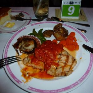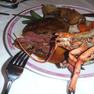 食事は、メインが出てくる時から冷めてしまっていたのが残念でした。ステーキはまだ良かったのですが、ロブスターは完全に冷めて少し生臭さの感じられるものでした。約100名分を次から次へと進めなければならないので大変だとは思いますが、かなり早いうちに席についたので、もう少し温かいものが出てきてもよいかなぁと思います。ただ、ディナーショーで、この値段なので仕方ないかなぁとは思います。